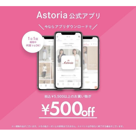 期间购买含税¥5,500以上,下载阿斯托利亚官方应用程序的话,将取消¥500☆